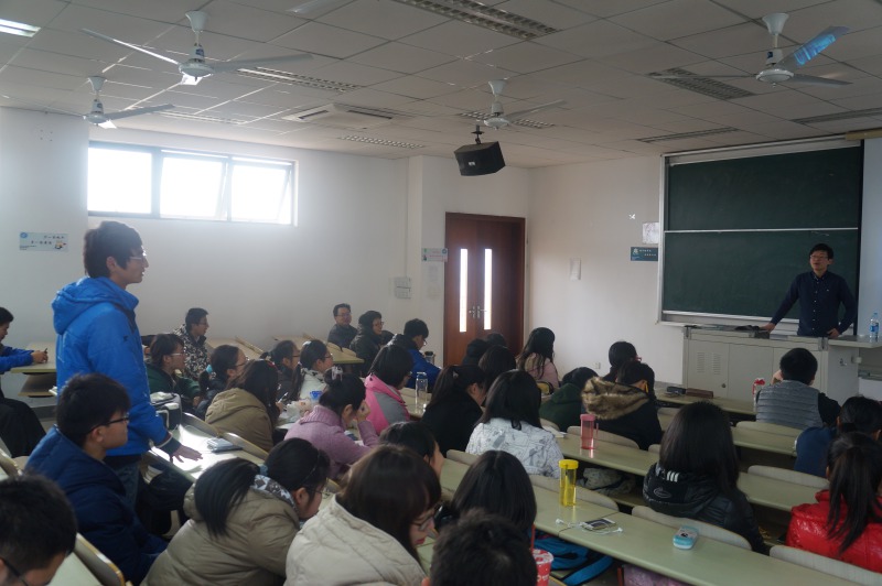 唐赟以幽默风趣的方式向同学们介绍了国外老员工活、参加交流项目的条件以及所需要的花费,提醒有出国意向的同学要关注学校的发文,并提前做好相关准备。