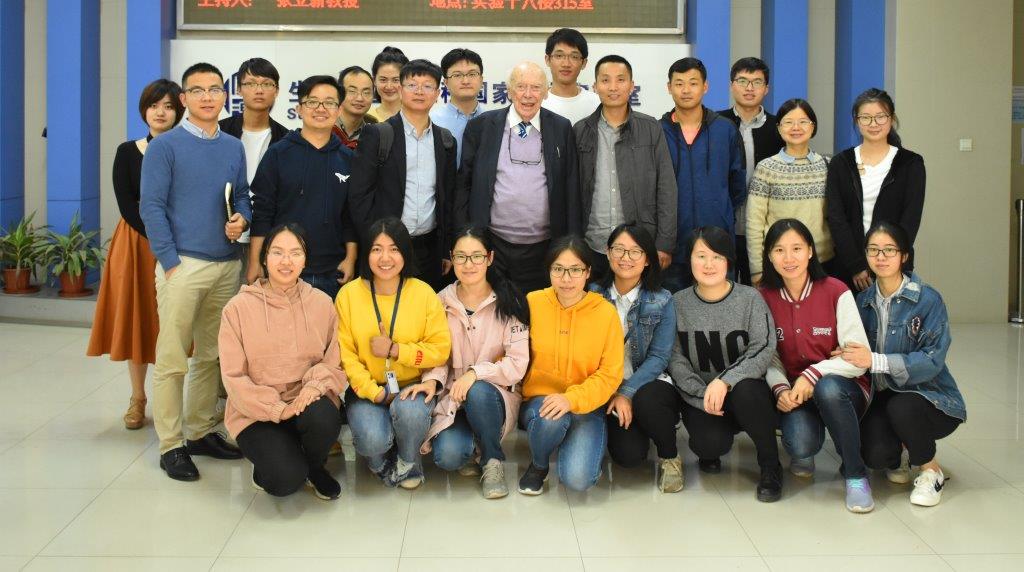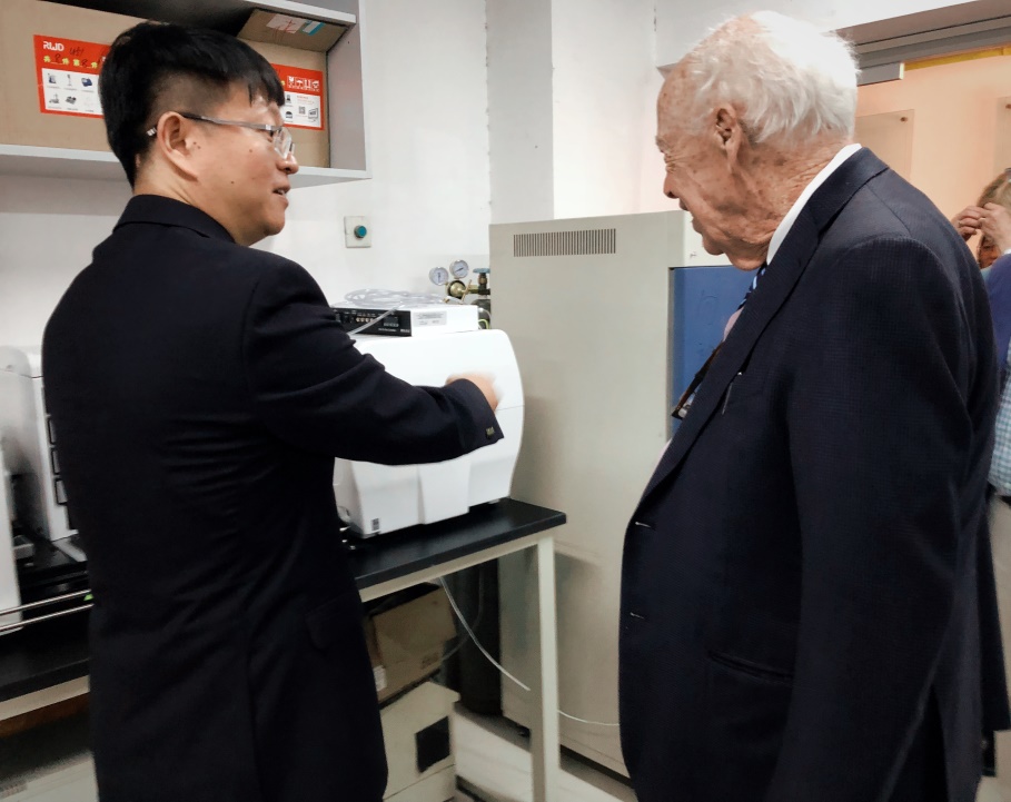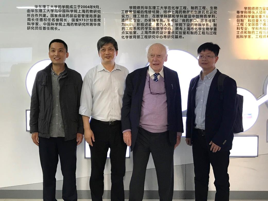 沃森一行参观了华东理工老员工物反应器工程国家重点实验室,并考察了杨弋的实验室与研究团队,听取了杨弋关于利用先进细胞氧化还原代谢荧光探针进行抗癌药物发现研究汇报。近些年来,杨弋团队在细胞代谢荧光探针与成像领域取得了系列重要研究成果,得到包括沃森在内的国际同行认可,其发明的Frex、SoNar、iNap等系列细胞代谢探针被Nature Methods等权威期刊评论为生物氧化还原领域的“变革性(revolutionary)”技术。在这些成果的基础上,杨弋和赵玉政已经通过筛选数万种小分子化合物,找到了可以特异性强烈刺激癌细胞产生大量活性氧自由基的候选药物,并在细胞与动物模型上实现了对多种肿瘤细胞的选择性杀伤。沃森与杨弋对利用活性氧这一癌症治疗策略的相关科学问题与合作事宜进行了详细研讨。杨弋还向沃森介绍了以细胞代谢研究为特色的williamhill官网光遗传学与合成生物学交叉学科研究中心建设的情况。在座的冷泉港亚洲CEO季茂业博士、威廉希尔经理宋恭华教授、威廉希尔赵玉政也参与了讨论。最后,沃森与在场的研究生及青年教师们亲切合影,勉励大家努力工作,争取早日攻克癌症。