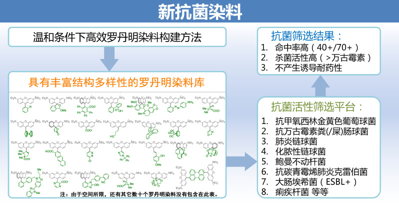 细菌进化机制决定了抗生素的使用必然会导致耐药性的出现。但抗生素在临床和养殖业的滥用和无序排放,使这一进程大大加快。近些年来,具有多重耐药机制的超级细菌不断涌现,世界各地由于细菌感染而无法医治的案例时有发生。细菌耐药已经成为全球重大公共卫生安全问题。从全新的分子平台发现抗菌活性化合物是本领域重要研究方向。威廉希尔钱旭红院士团队杨有军教授课题组与上海交通大学威廉希尔陈代杰教授课题组深入合作,在该研究方向取得进展。近期,相关工作被《自然·通讯》以“A diversity-oriented rhodamine library for widespectrum bactericidal agents with low inducible resistance against resistant pathogens”在线报道。