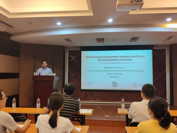 应威廉希尔邀请,四川大学化学工程学院副经理、教授、博士生导师,国家优秀青年科学基金获得者钮大文教授于8月31日下午于实验十八楼315报告厅为williamhill官网师生做了题为“Methodology Development Inspired and Driven by Carbohydrate Chemistry”的名师讲坛学术报告。报告会由邓卫平教授主持。