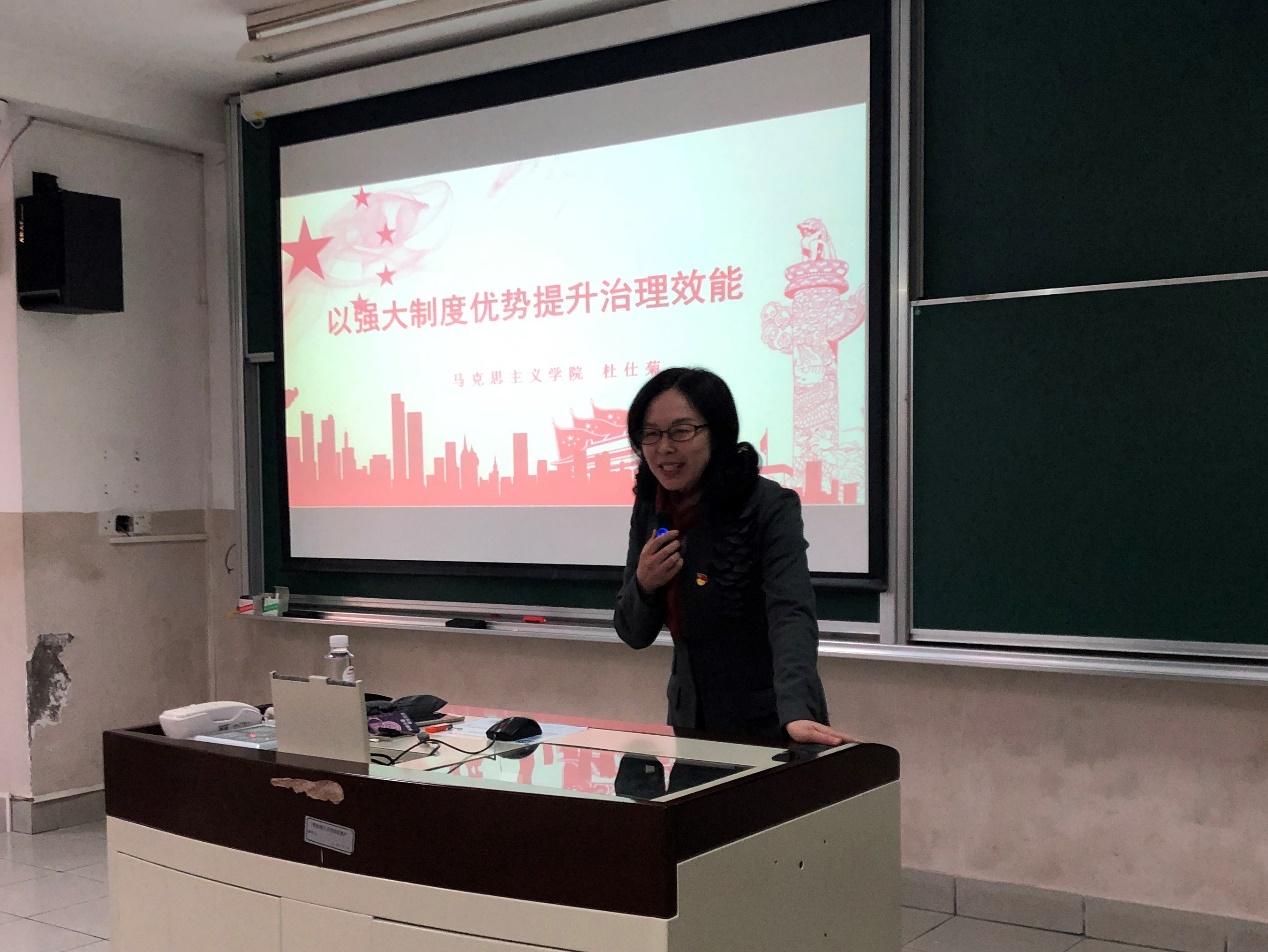 12月13日中午,公司党委在四教102开展十九届四中全会精神主题学习教育专题报告会。公司党的十九届四中全会精神理论宣讲团成员、马克思主义学院经理杜仕菊教授,应邀做了题为“以强大制度优势提升治理效能”的报告。威廉希尔经理宋恭华等班子成员和学院师生参加了报告会,报告会由公司党委书记张青主持。