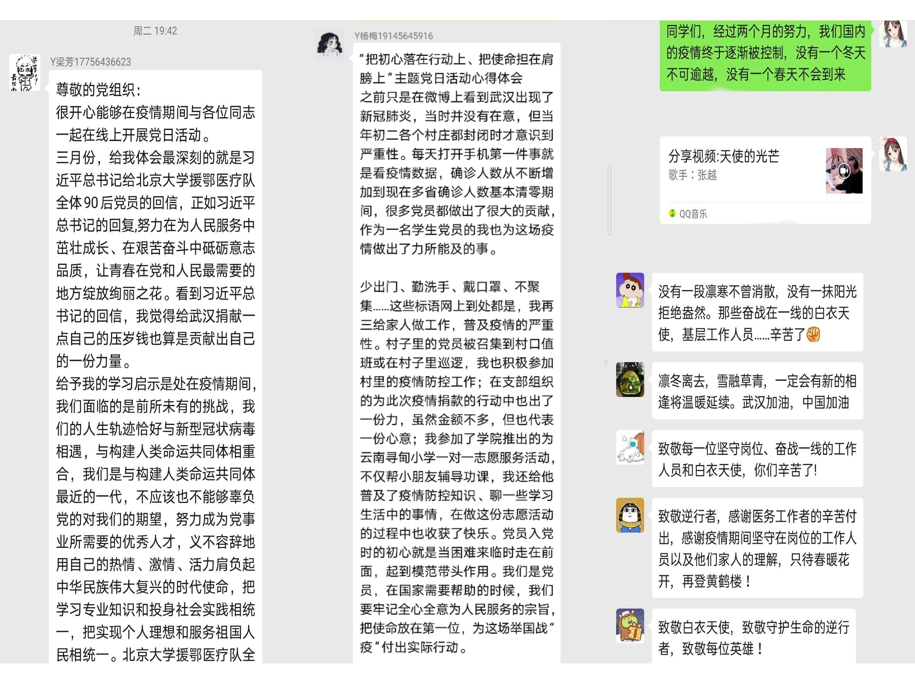 疫情期间,公司员工党员积极响应组织号召在村委、居委开展志愿服务工作,尽己所能捐款捐物。在本次党日活动中,这些在抗疫期间努力作出自己贡献的同学也都在支部内分享自己的感思,激励全体研究生党员时刻牢记为民初心,尽己所能服务社会、服务人民。也有支部以逆行医护人员、雷神山建设者、社区基层工作人员的感人事迹及习近平总书记给北大援鄂医疗队全体“90后”党员的重要回信为学习素材开展讨论。